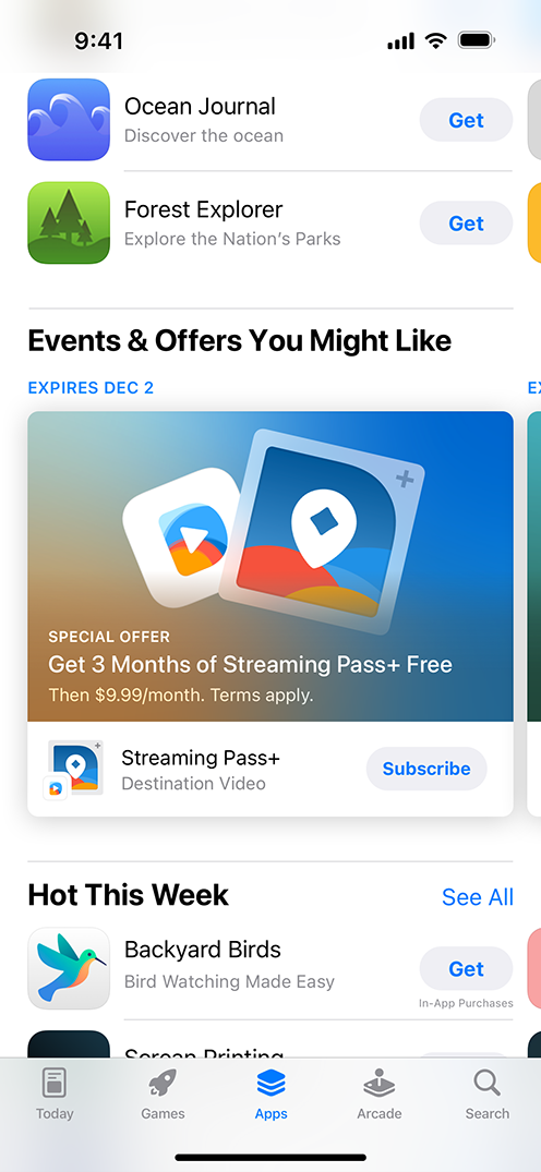 On the App Store: On your product page and in editorial selections and personalized recommendations on the Today, Games, and Apps tabs if you’ve been featured. People can tap your offer to learn more details about your offer and open or redownload your app or game to seamlessly redeem your offer.