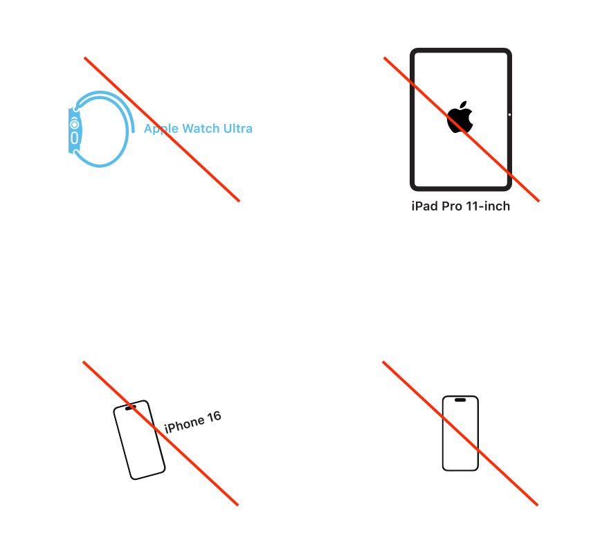 在宣传材料中使用 iPhone、iPad、iPod、Apple Watch、Apple TV 和 AirPods 的图标,帮助顾客确定你的产品与特定的 Apple 设备机型兼容。