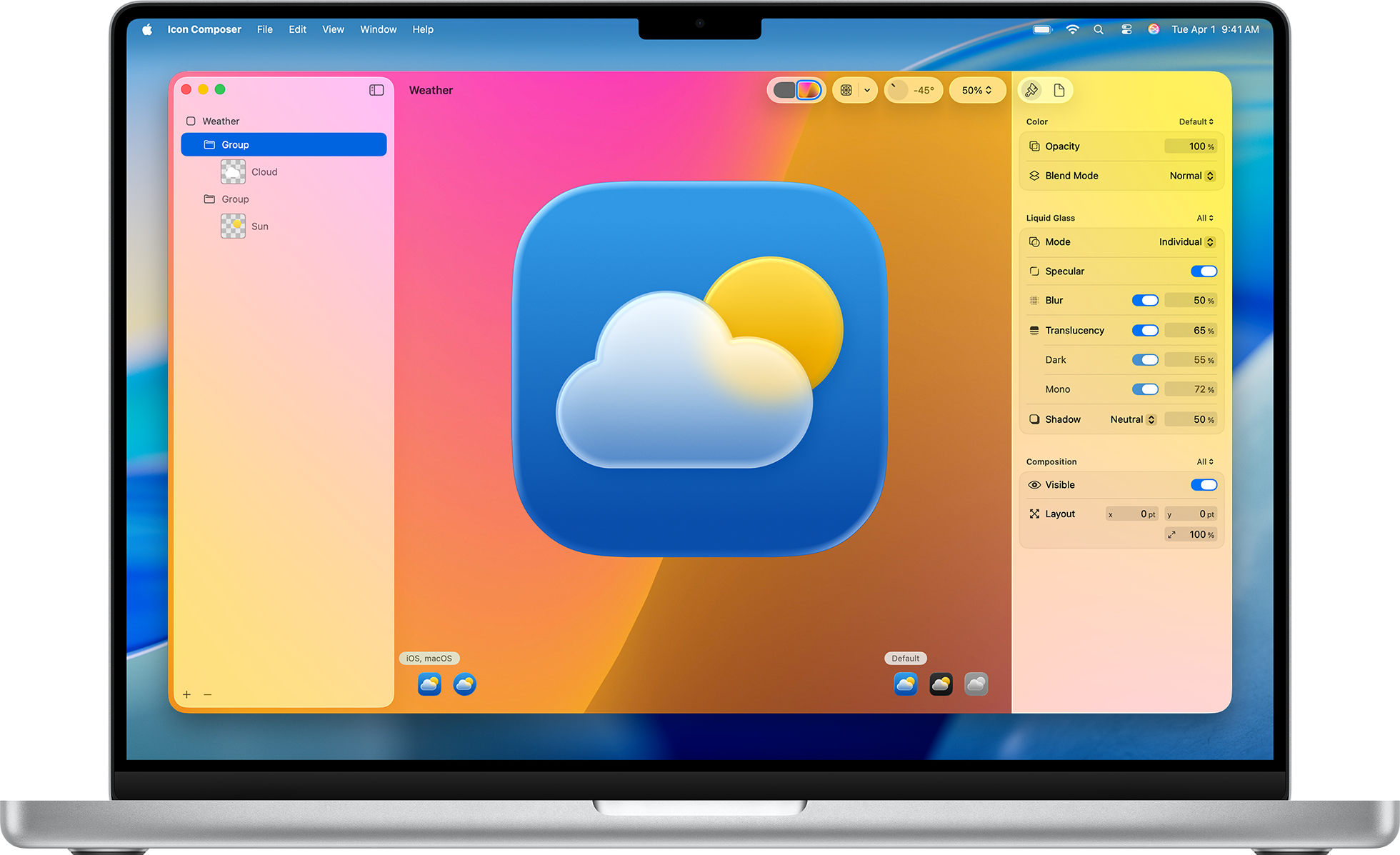 Bring your icon to life with Liquid Glass—a new material featuring a range of expressive properties that respond to dynamic lighting and automatically scale with your icon. Import and organize your artwork layers, and adjust properties like specular highlights, blur, translucency, and shadows to create icons with new levels of depth and dimension.