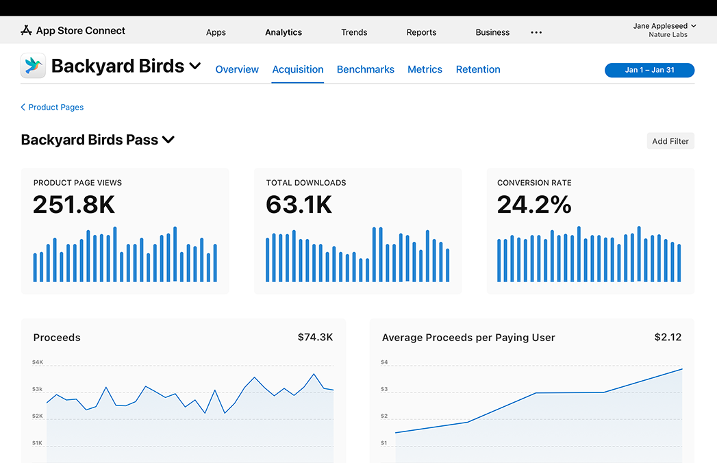 Measure your app’s performance and grow your business on the App Store with unique data insights that only Apple provides. Each month, Apple collects billions of data points to give you valuable information, including: