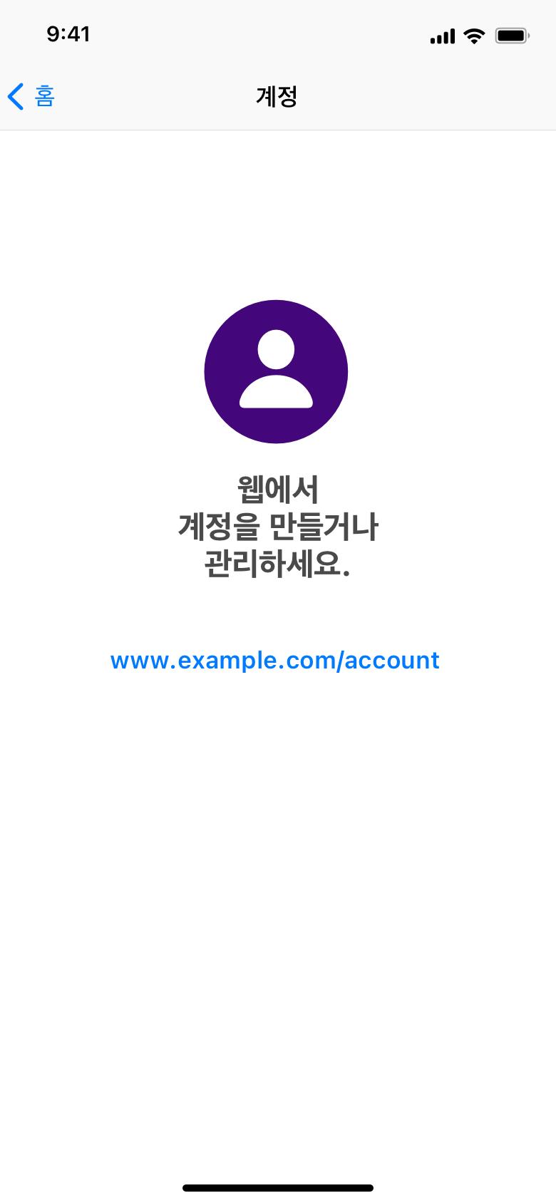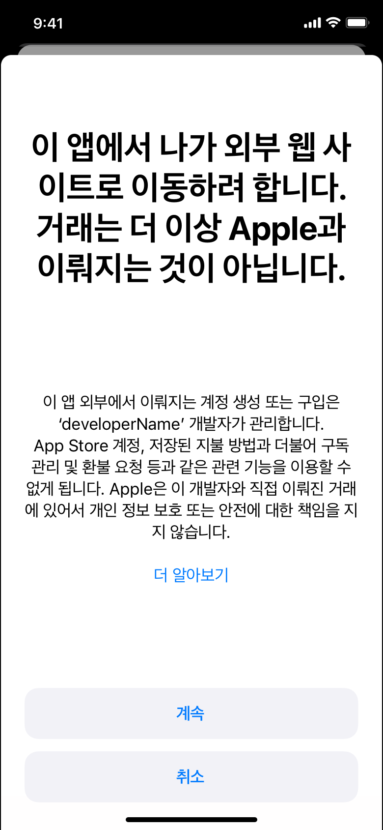 모달 시트 세부 사항 따르기. iOS 16 및/또는 iPadOS 16 이후 버전 및 tvOS 16.4 이후 버전에서는 해당 사항을 External Link Account API를 사용하여 구현할 수 있습니다. 그 이전 버전의 iOS 또는 iPadOS를 사용하는 기기에서는 아래에 제공된 모달 시트의 디자인 및 텍스트를 그대로 따라 모달 시트를 구현해야 합니다.