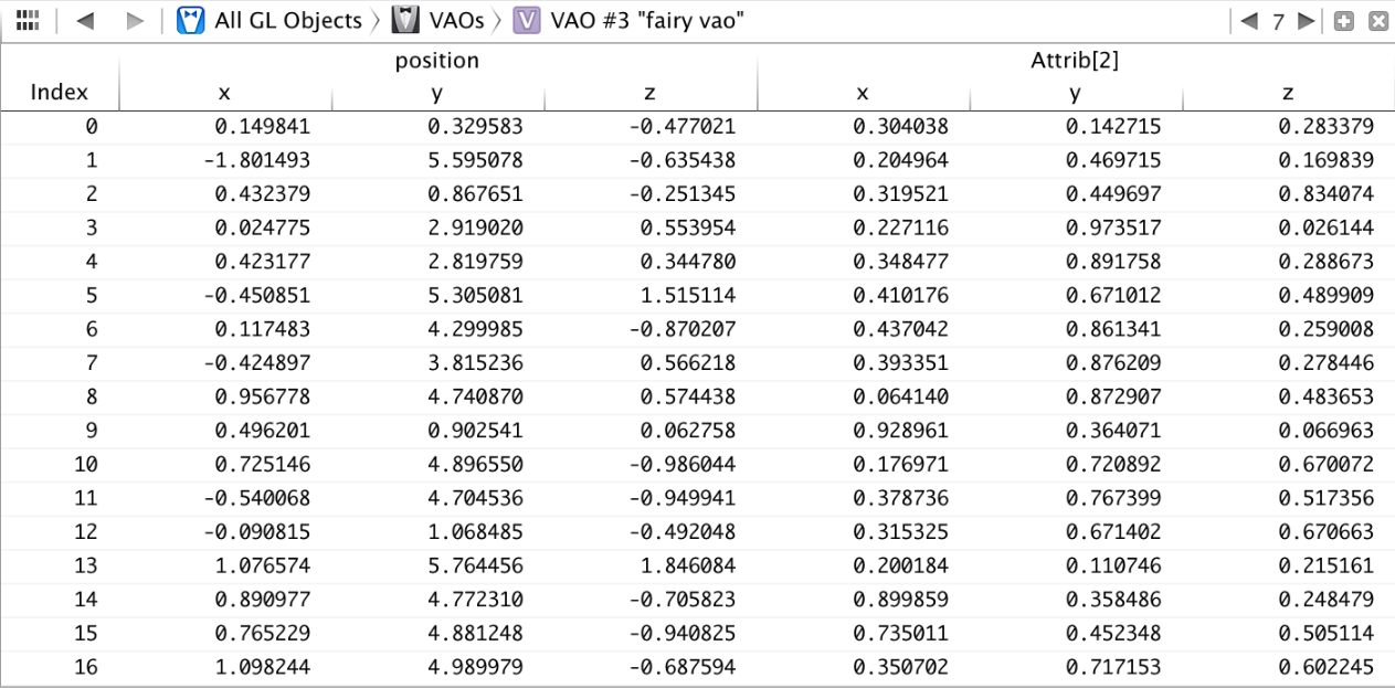 A vertex array object (VAO) encapsulates one or more data buffers in OpenGL ES memory and the attribute bindings used for supplying vertex data from the buffers to a shader program. (For details on using VAOs, see Consolidate Vertex Array State Changes Using Vertex Array Objects.) Because the VAO bindings include information about the format of the buffers’ contents, inspecting a VAO shows its contents as interpreted by OpenGL ES (see Figure B-10).