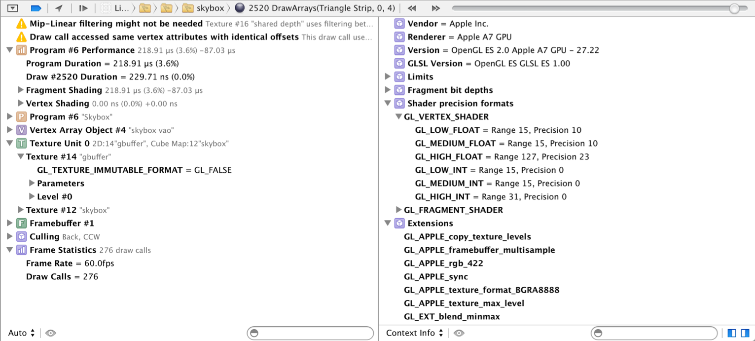 The Context Info view, shown on the right in Figure B-14, lists static information about the OpenGL ES renderer in use: name, version, capabilities, extensions and similar data. You can look through this data instead of writing your own code to query renderer attributes such as GL_MAX_TEXTURE_IMAGE_UNITS and GL_EXTENSIONS.
