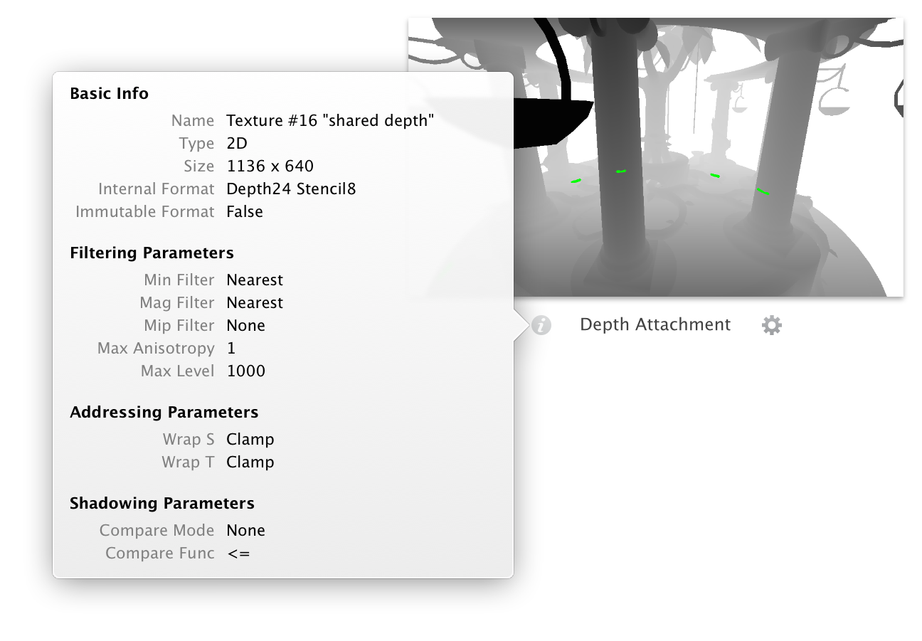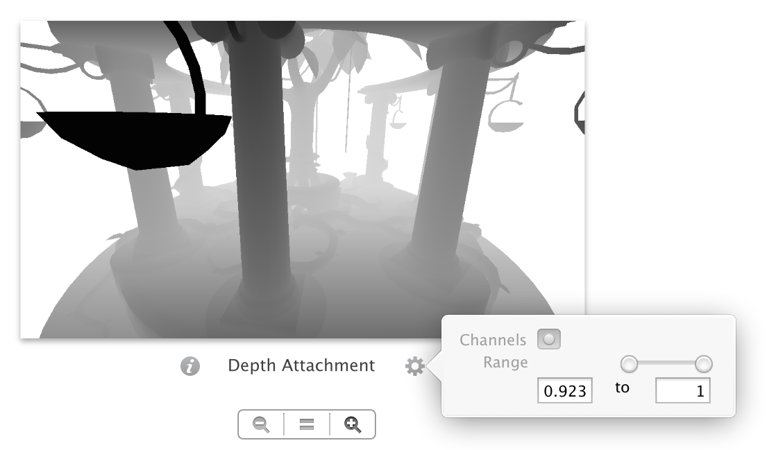 The editor shows a preview for each framebuffer attachment currently bound for drawing. For example, most approaches to 3D rendering use a framebuffer with attachments for both color and depth, as illustrated in . Use the controls in the lower left of the editor to choose which framebuffer attachments are currently shown. Clicking the info button, left of each framebuffer attachment’s name, shows a popover detailing the attachment’s properties, as shown in Figure B-6. Click the settings button, right of the framebuffer attachment’s name, to show a popover with controls that adjust the preview image. For example, you can use these controls to make a certain range of Z values in a depth buffer more visible in its grayscale preview, as shown in Figure B-7.