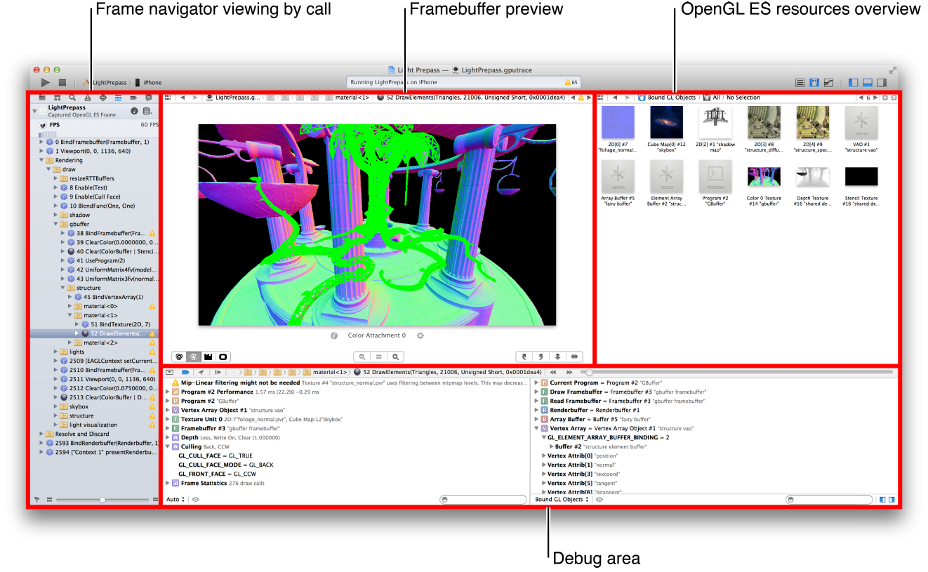 After Xcode captures a frame, it automatically reconfigures its interface for OpenGL ES debugging. The OpenGL ES Frame Debugger interface modifies several areas of the Xcode workspace window to provide information about the OpenGL ES rendering process, as shown in Figure B-3 and Figure B-4 and summarized below. (The frame debugger does not use the inspector or library panes, so you may wish to hide Xcode’s utility area during OpenGL ES debugging.)