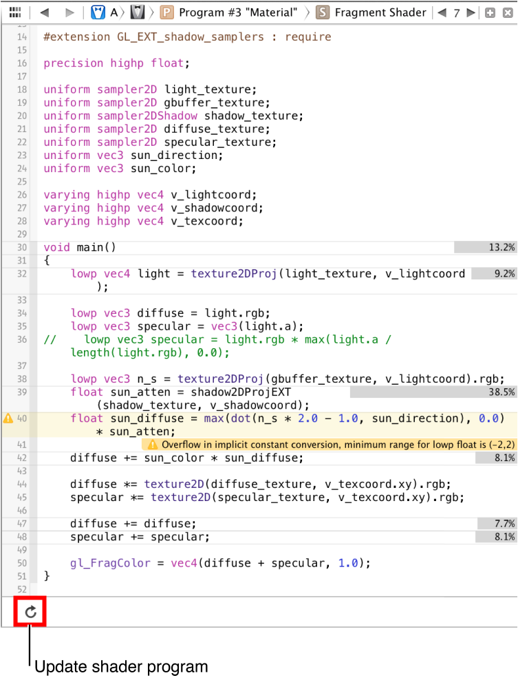 You can make changes to the shader source code in the editor. Then, click the Update button below the editor (shown in Figure B-8) to recompile the shader program and see its effects on the captured frame. If compiling the shader results in error or warning messages from the GLSL compiler, Xcode annotates the shader source code for each issue. The recompiled shader program remains in use on the device, so you can resume running your app. Click the Continue button in the debug bar to see your shader changes in action.