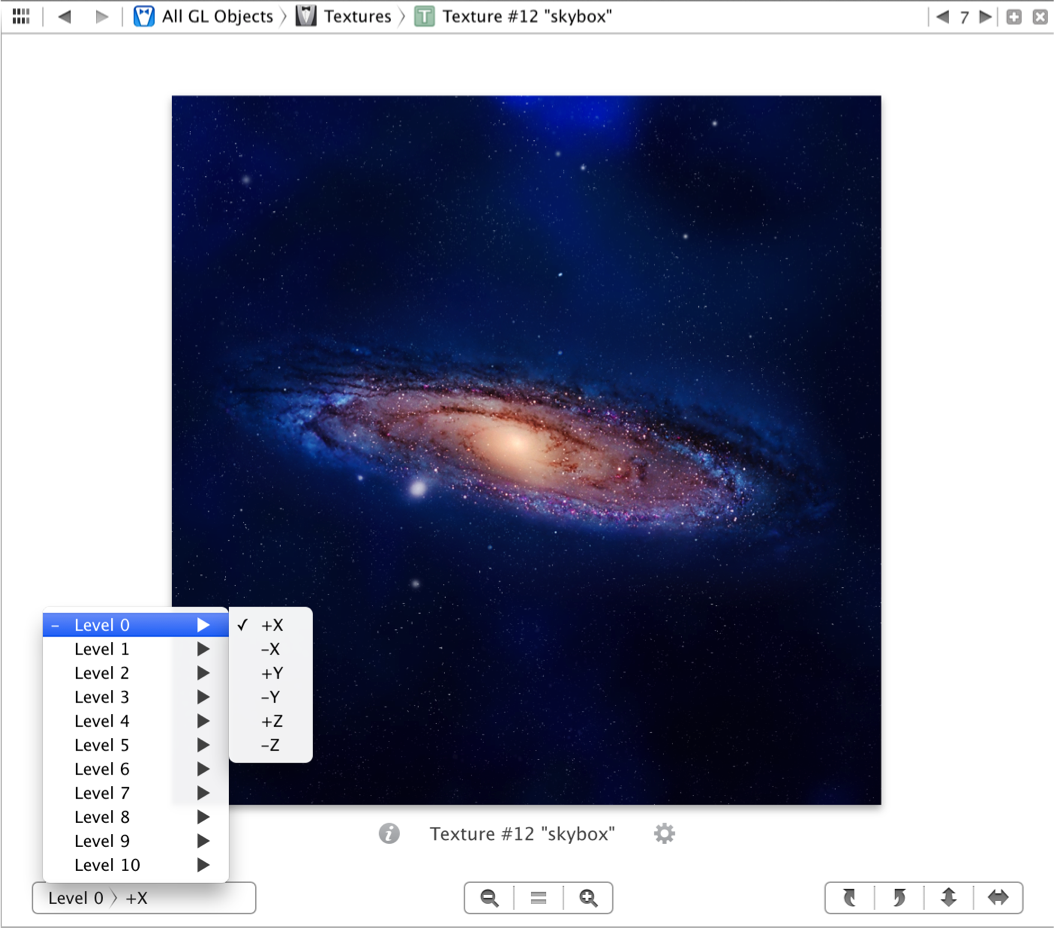 When you inspect a texture or renderbuffer, the assistant editor shows an image preview of its contents. You can use the same controls found in the primary editor to get more information about the texture object or renderbuffer and to adjust the image preview. For textures, you can use an additional control in the lower left corner of the assistant editor to preview each mipmap level of the texture and (if applicable) each face of a cube map texture (as shown in Figure B-11).