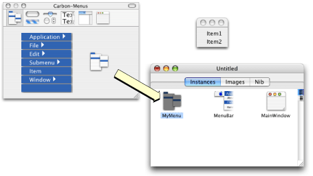 To create a standalone menu, drag the menu icon in the lower right of the Menus palette to the Instances pane of the main nib window. A menu then appears in the Instances pane, and a small menu window appears containing two items. By selecting the menu in the instance pane, you can change its title and other attributes in the Info window. You can modify the menu items in a similar fashion, just as if they were in a menu installed in the menu bar.