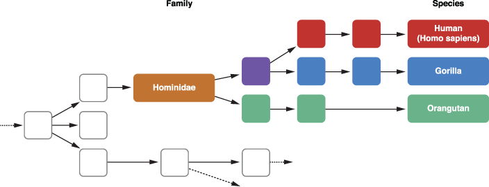 Gorillas, humans, and orangutans, for example, have a number of obvious similarities. Although they each belong to different species, and even different genera, tribes, and subfamilies, they are taxonomically related since they all belong to the same family (called “Hominidae”), as shown in Figure 1-1.
