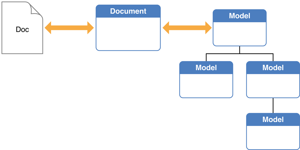 Any objects that are part of the persistent state of a document should be considered part of that document’s model. For example, the Sketch sample app has a subclass of NSDocument named SKTDocument. Objects of this class have an array of SKTGraphic objects containing the data that defines the shapes Sketch can draw, so they form the data model of the document. Besides the actual SKTGraphic objects, however, the SKTDocument object contains some additional data that should technically be considered part of the model, such as the order of the graphics within the document’s array, which determines the front-to-back ordering of the SKTGraphic objects.