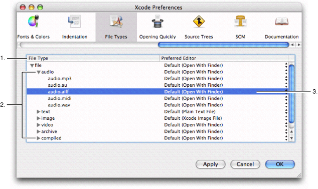 2. File type categories. File type entries are organized into groups, from most general to most specific. For example, the audio.mp3 and audio.aiff file types belong to the “audio” group, which belongs to the “file” group. In this way, you can control the default editor used for an entire class of files. To see the file types in a group, click the disclosure triangle next to that group.