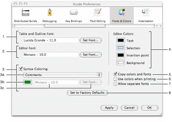 7. “Allow separate fonts” controls whether Xcode lets you set fonts individually for the code elements used for syntax coloring, as described in item 3. If this option is selected, you can set the font for each code element separately. Otherwise, Xcode uses the font specified by the Editor Font option (described in item 2) for all text in an editor, regardless of the code element. This option does not affect the colors used for various code elements when syntax coloring is on. This option is disabled by default.