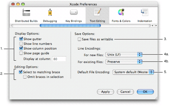 4. Line Encodings. These menus control the default line endings used for files in Xcode. You can use Unix, Windows, or Mac line endings for files that you open and edit in Xcode; the type of line endings used for a file can affect which file editors and other tools can interpret the file. See Changing Line Endings for more information on line endings. The menus are: