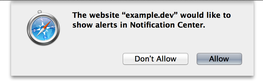 If the permission level is default, it’s likely that the user hasn’t yet been prompted to grant access to notifications from your domain. Prompt your users with a Safari dialog box, as shown in Figure 3-1, by calling the requestPermission() function on the Notification object. This function accepts one parameter, a callback function, which executes when the user grants or denies permission.