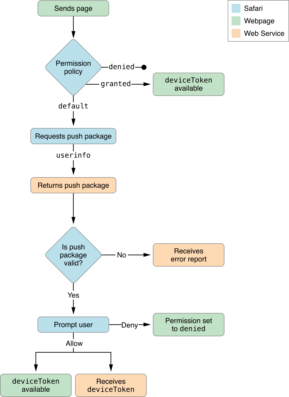 When a user is asked for permission to receive push notifications, Safari asks your web server for a package. The package contains data that is used by the notification UI, such as your website name and icon, as well as a cryptographic signature. The signature verifies that your notification hasn’t been intercepted by a man-in-the-middle attack and that it is indeed coming from a trusted source: you.