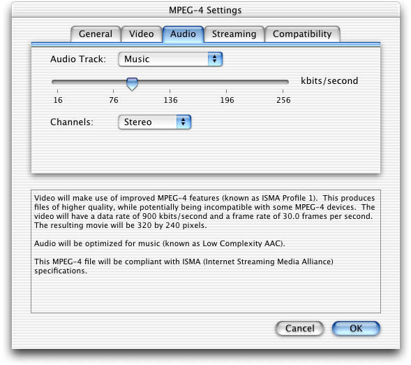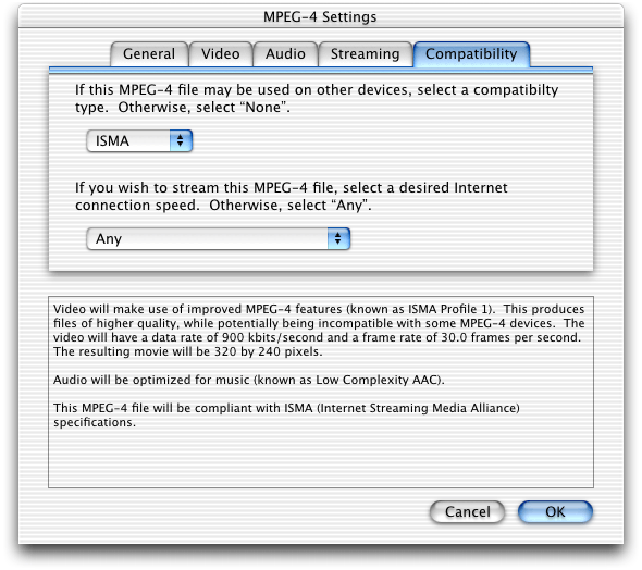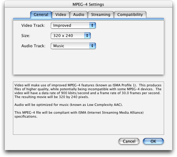 QuickTime 6 supports ISO-compliant MPEG-4 video and audio, both encode and decode. This means that you can create and play back MPEG-4 video and audio content. In addition, you can play back MPEG-4 audio encoded using Advanced Audio Coding (AAC).