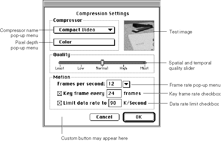 The standard image compression dialog component provided by Apple allows you to augment or extend the interface provided by its dialog boxes. This component supports a single custom button. Your application enables this button when it instructs the component to display the dialog box to the user. You provide the code that supports this button in a hook function in your application. In addition, this component allows you to define a filter function; you can use this function to process dialog box events before the component. Figure 14-1 identifies the parts of the dialog box supported by Apple’s standard dialog component.