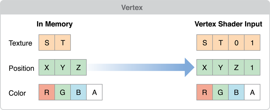 You can specify vertex data as a series of arrays (also known as a struct of arrays) or as an array where each element includes multiple attributes (an array of structs). The preferred format on iOS is an array of structs with a single interleaved vertex format. Interleaved data provides better memory locality for each vertex.