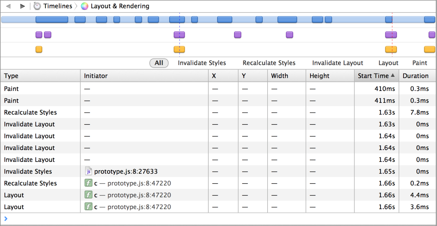 Just as you can see great detail about every resource that has loaded, you can see great detail about how Safari's rendering engine, WebKit, renders the page. Click on Layout & Rendering in the Timelines pane to display a table of each paint that has been rendered, as shown in Figure 3-2. Each layout calculation and paint rendering is represented by a purple horizontal bar.