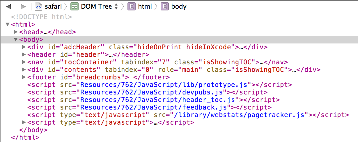Source Code reads the page’s HTML as if you opened it in a text editor. The source code reflects your HTML structure before any JavaScript is loaded. While the contents can’t be edited, it’s useful to see the HTML Safari receives from the server.