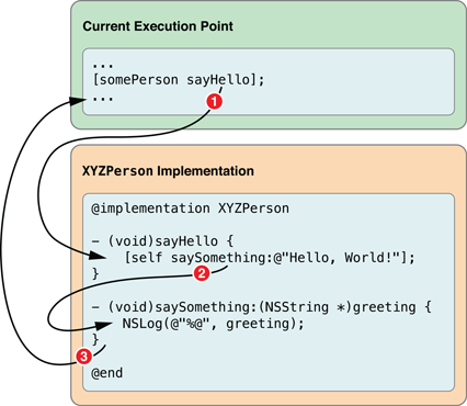 Sending an Objective-C message is conceptually very much like calling a C function. Figure 2-1 shows the effective program flow for the sayHello message.