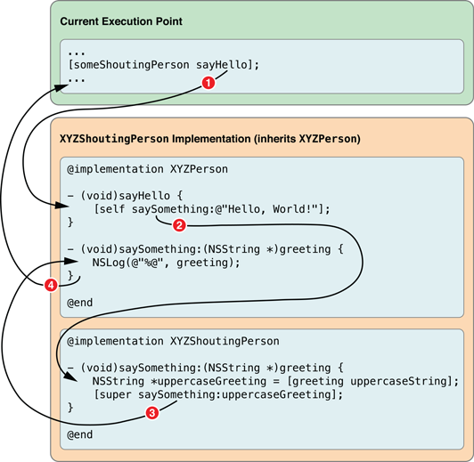 Because sayHello is implemented by XYZPerson, and XYZShoutingPerson is set to inherit from XYZPerson, you can call sayHello on an XYZShoutingPerson object as well. When you call sayHello on an XYZShoutingPerson, the call to [self saySomething:...] will use the overridden implementation and display the greeting as uppercase, resulting in the effective program flow shown in Figure 2-3.