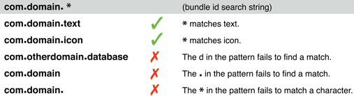 When you use a wildcard app ID, characters preceding the asterisk (if any) must match the characters in the bundle ID, exactly as they would for an explicit app ID. The asterisk matches all remaining characters in the bundle ID. Further, the asterisk must match at least one character in the bundle ID. Figure 3-5 shows an example search string and shows that it matches some bundle IDs but not others.