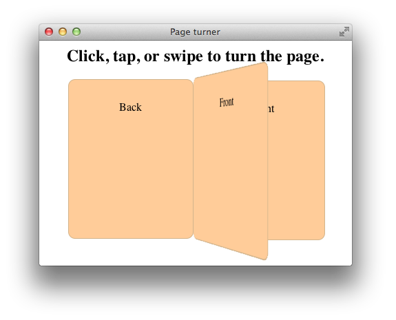 In the next example, the user can flip a virtual page forward or backward with a click, a tap, or a swipe. Two div elements are styled to look like pages and are positioned back to back, and the example uses a 3D transform to create an animation that looks like the page of a book turning.