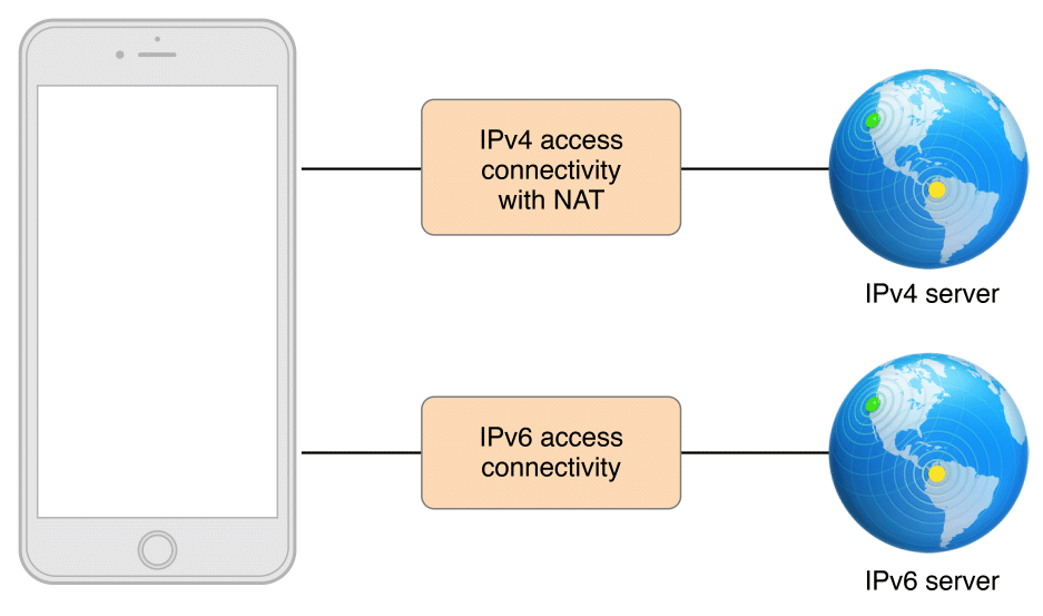 NSURLSessionand the CFNetwork frameworks and you connect by name, you should not need to change anything for your app to work with IPv6 addresses. If you aren’t connecting by name, you probably should be. See Avoid Resolving DNS Names Before Connecting to a Host to learn how. For information on CFNetwork, see CFNetwork Framework Reference.If you’re writing a server-side app or other low-level networking app, you need to make sure your socket code works correctly with both IPv4 and IPv6 addresses. Refer to RFC4038: Application Aspects of IPv6 Transition.