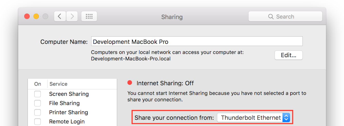 Choose the network interface that provides your Internet connection, such as Thunderbolt Ethernet.