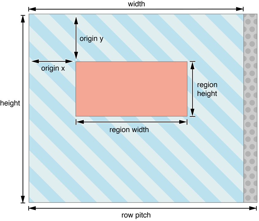 In Figure 7-3, the memory that contains the image is represented by the striped rectangle bounded by the width and the height, and includes the solid-colored region in its center. The region (represented by the solid pink rectangle bounded by the region width and region height), specifies the shape and size of the part of the image you want to manipulate. In other words, the region is just a certain amount of memory which lives at a given offset (or origin) into the image. The origin is the (x,y,z) position of the region within the image.