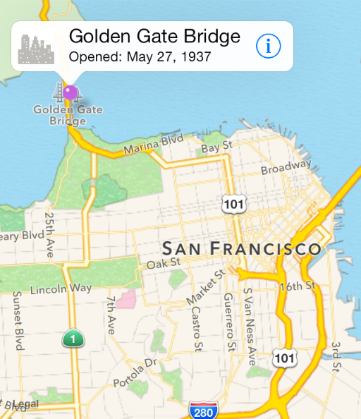 Annotations offer a way to highlight specific coordinates on the map and provide additional information about them. You can use annotations to call out particular addresses, points of interest, and other types of destinations. When displayed on a map, annotations typically have some sort of image to identify their location and may also have a callout bubble providing information and links to more content. Figure 6-1 shows an annotation that uses a standard pin annotation view to mark a particular location and provides a callout bubble that displays additional information including a disclosure indicator that leads to more details.