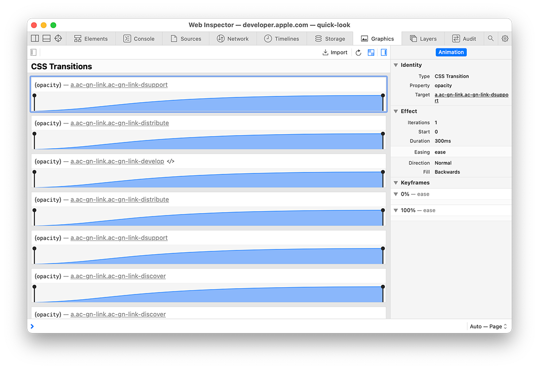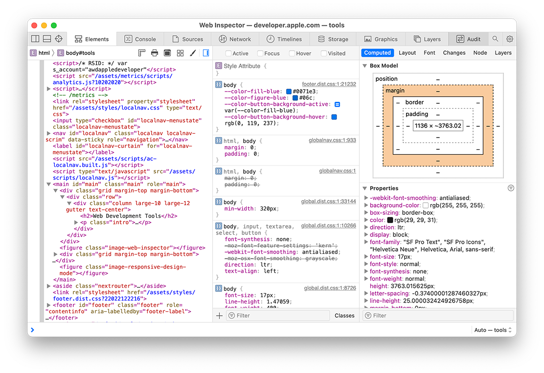 Web Inspector is your command center, giving you quick and easy access to the richest set of development tools ever included in a web browser. It helps you inspect all of the resources and activity on a web page, making development more efficient across Apple platforms. The clean, unified design puts each core function in a separate tab, which you can rearrange to fit your workflow. You can even debug memory using Timelines and tweak styles using widgets for over 150 of the most common CSS properties.