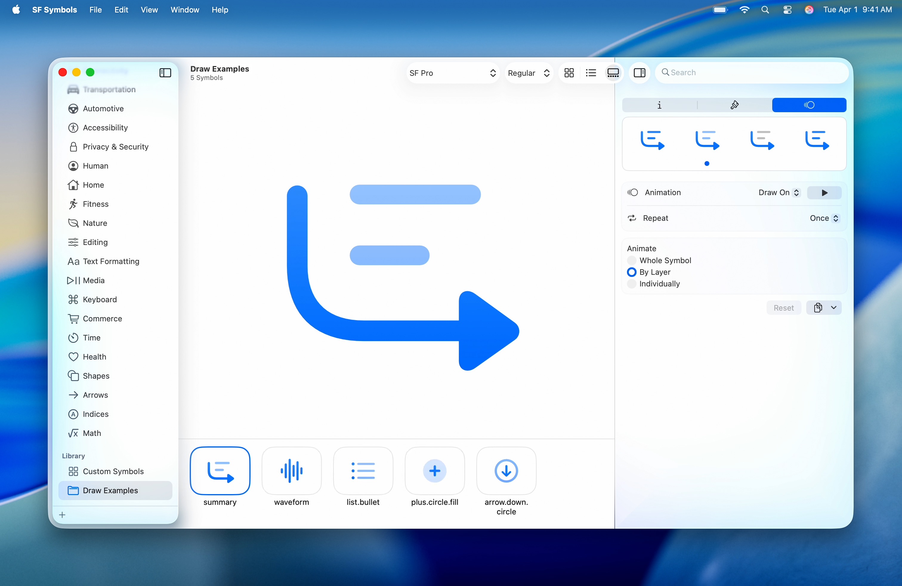 New annotation tools make it easy to create Draw animations for custom symbols with just a few clicks. Place guide points on layers to control how a path draws from beginning to end. Guide point placement is automatically translated across weights and can be customized in Ultralight, Regular, and Black to precisely control movement across all symbol weights and scales. Create bespoke animations tailored to your custom symbols by leveraging draw attachments, optional bi-directionality, adaptive end caps, and more.